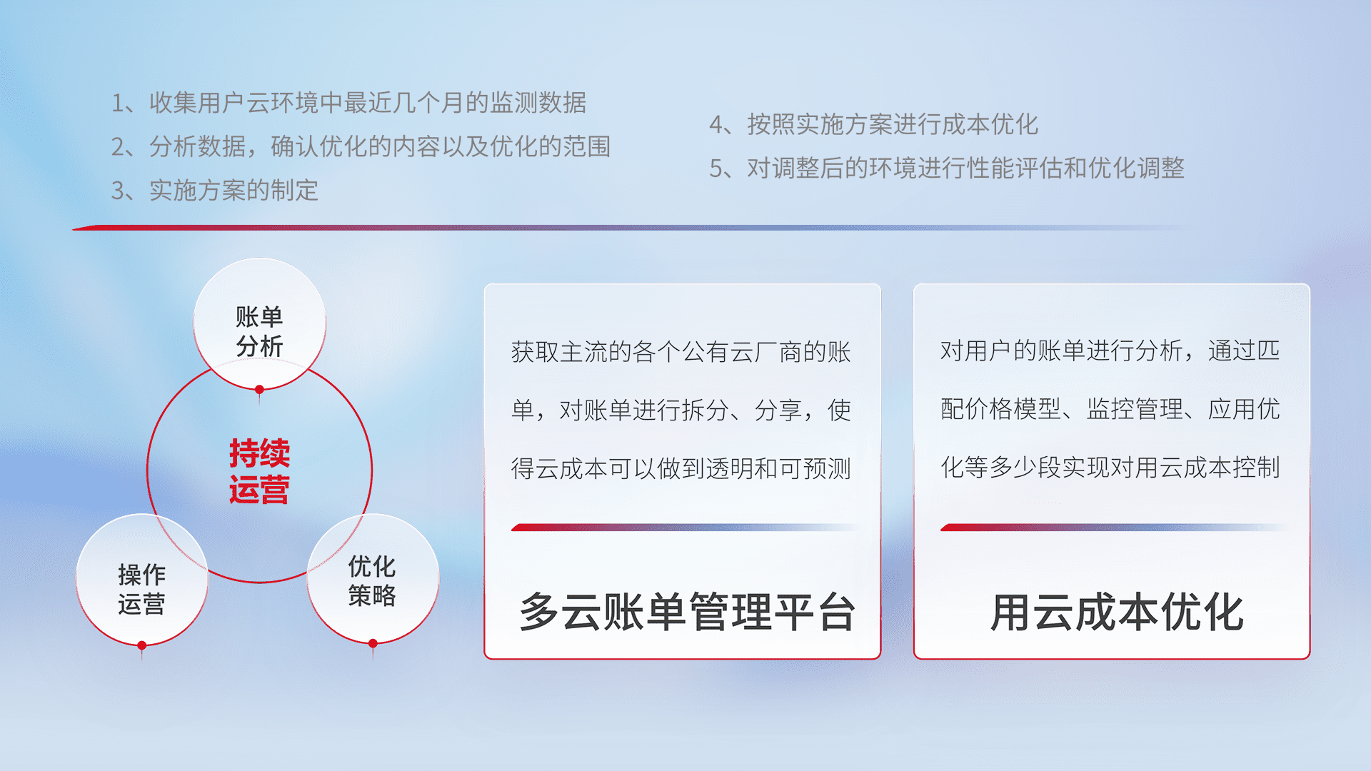 运用智能化工具分析云资源,,提供日常费用可视化工具,,,,自动账单拆分,,,成本优化云上费用,,,降本增效。。