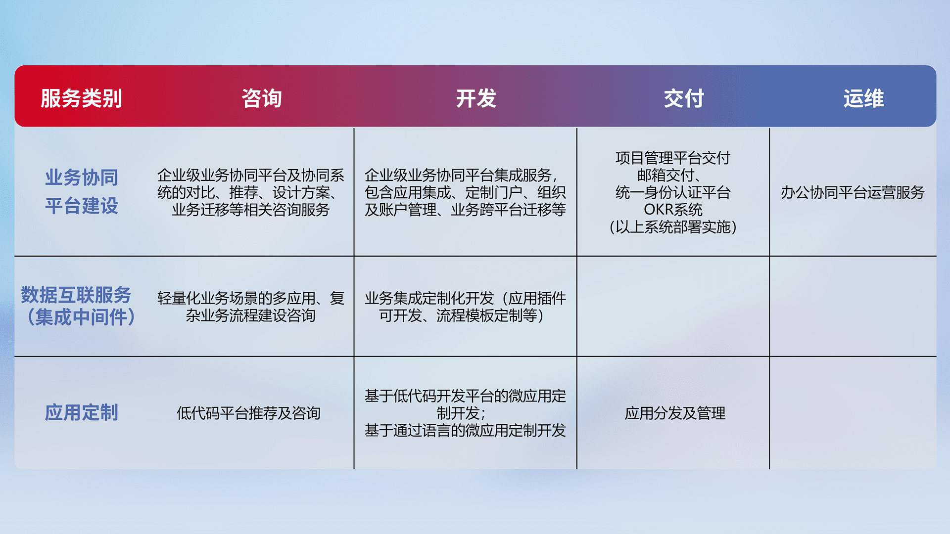 针对钉钉、、、企微、、、、IDaas等平台级产品提供产品的规划、、、、方案、、交付、、定制化开发等服务,,,,实现如统一协同办公、、、智能客户服务、、、、混合会议管理、、、智能数据查询、、、等业务场景,,,实现数字化转型。。